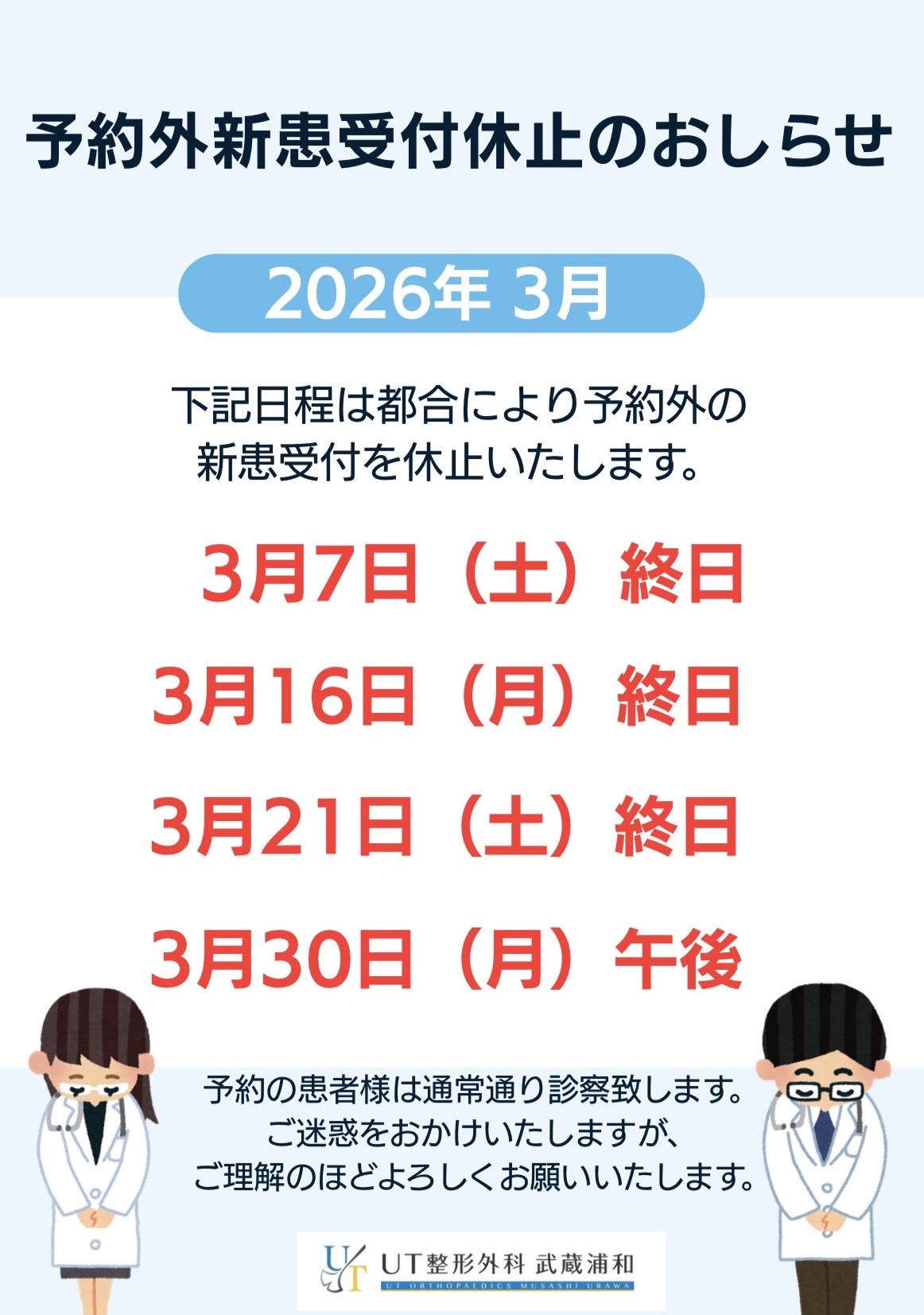 3月予約外新患受付休止日のご案内