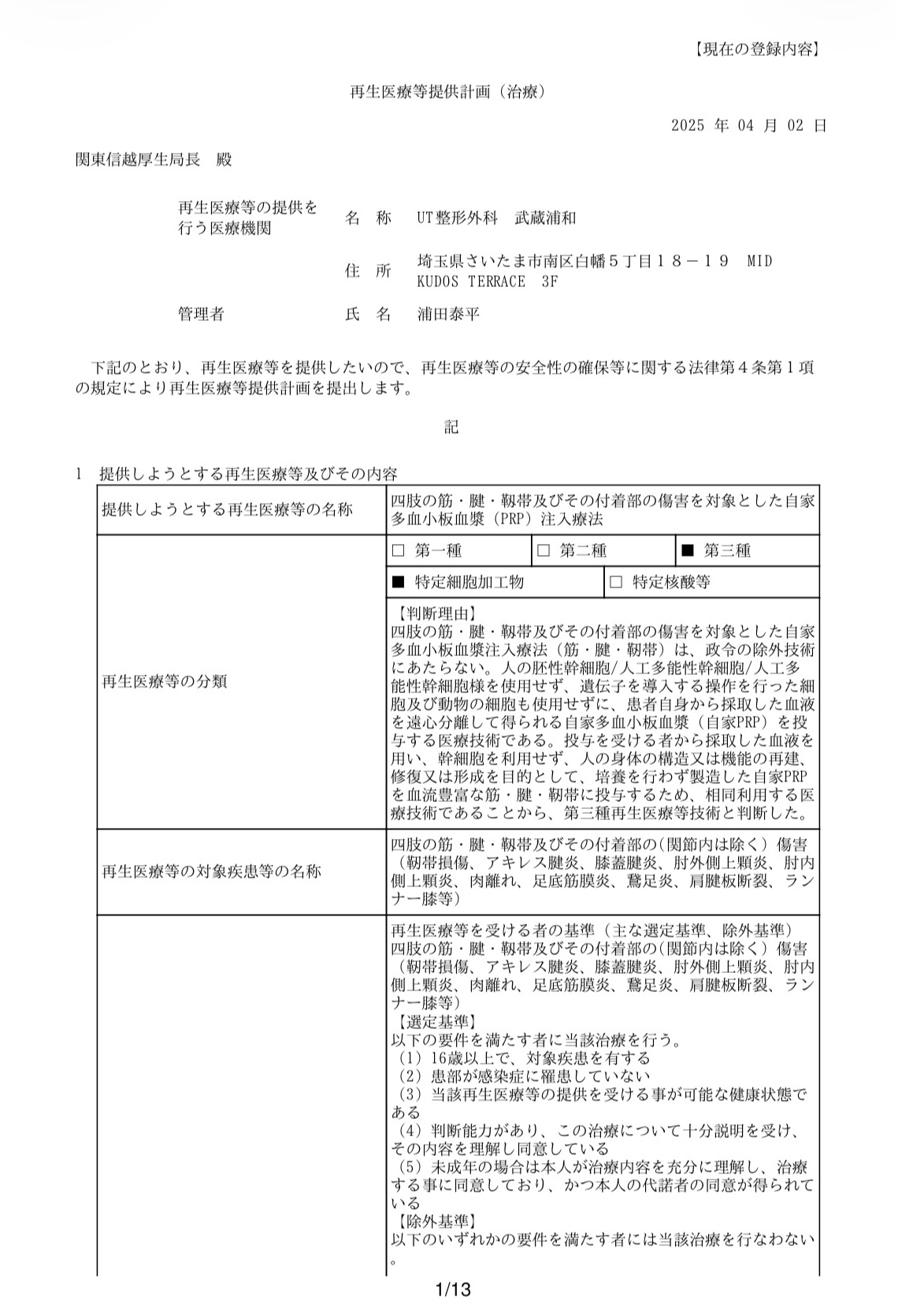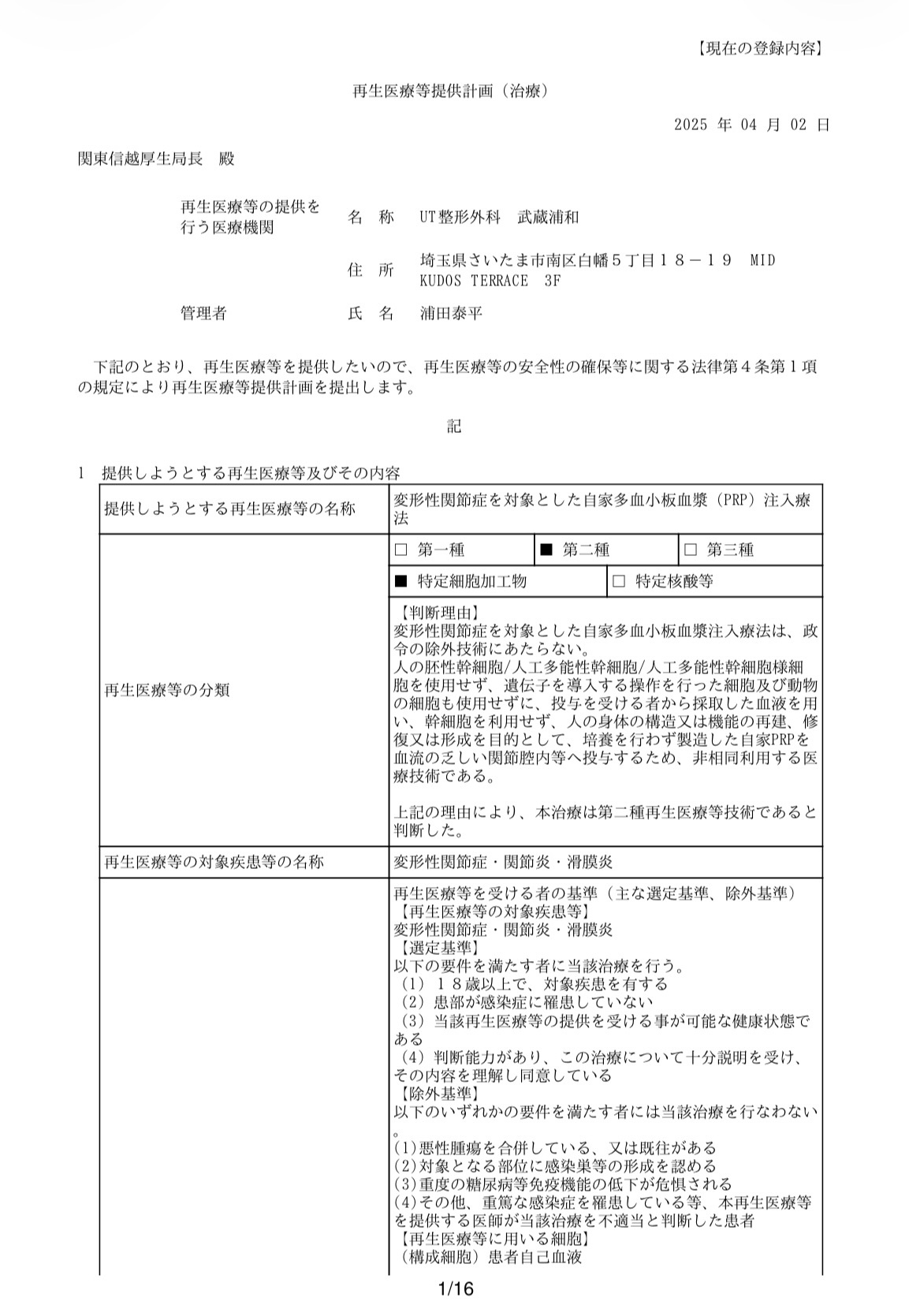 また、PRPの注入は、第三種再生医療(筋・腱・靭帯への注入)と、第二種再生医療(関節腔内への注入)があり、当院はその両方の承認を得ています。