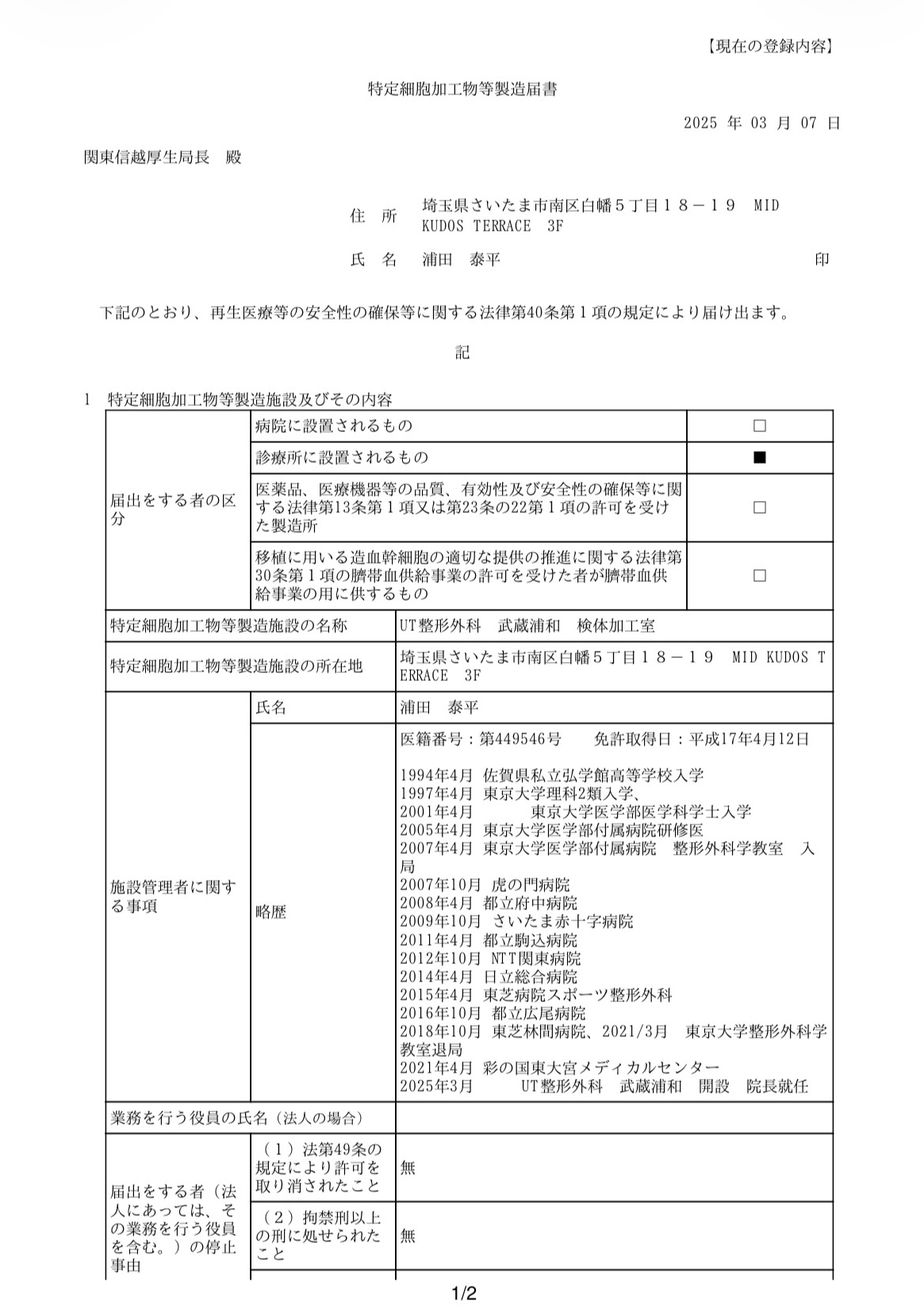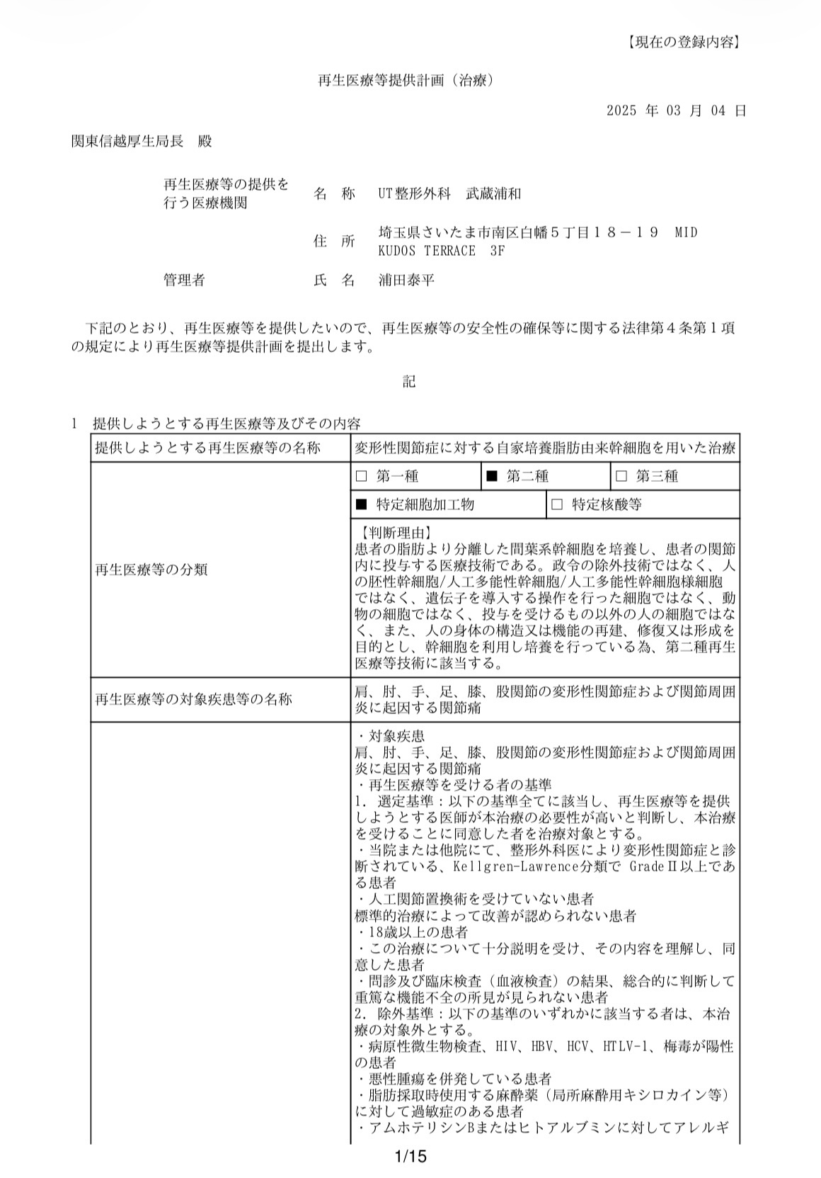 再生医療は「再生医療等の安全性の確保等に関する法律(再生医療等安全性確保法)」に基づき、第二種および第三種再生医療として「再生医療等提供計画」を厚生労働省に届け出、受理されております。